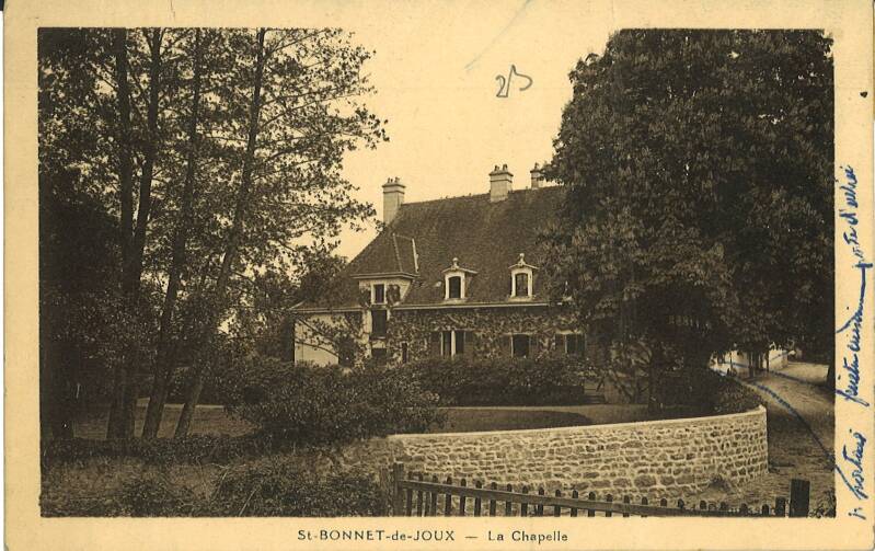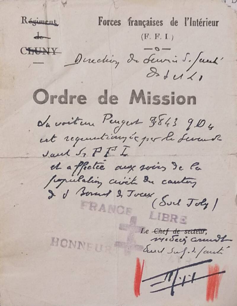 Dans la nuit du 19 au 20 août 1944 à “La Chapelle”, commune de St Bonnet de Joux (S&L), mon mari, docteur en médecine, et moi étions réveillés par la sonnette de nuit. Depuis le débarquement, ce fait se reproduisait assez souvent, car depuis le 6 juin il ne s’était pas passé un jour ou une nuit sans que mon mari n’ait eu à soigner des blessés ou des malades de la Résistance. Arrivée la première dans les deux pièces donnant sur la route (cuisine et évier), d’où nous avions l’habitude de répondre aux clients, la nuit, je demandai :