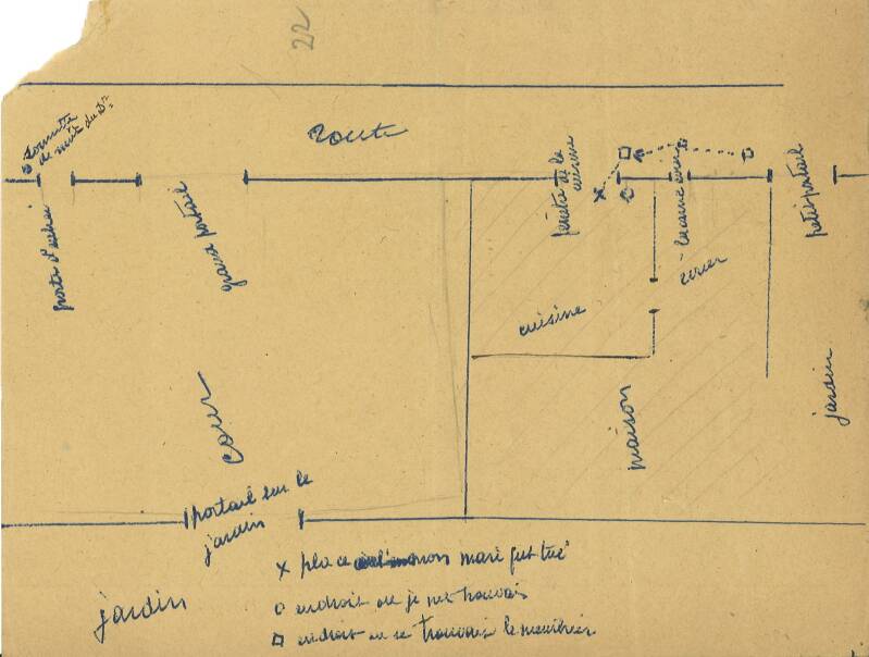 Revenant aux faits concernant mon mari, je crois devoir préciser que les personnes venant pour la première fois, de nuit à la maison, et ne connaissant pas les habitudes, attendaient au portail et mettaient quelques instants à venir à la fenêtre de la cuisine, de laquelle on leur répondait, fenêtre distante de 25 mètres environ de la porte d’entrée. Or l’homme qui m’a répondu était là dès que j’eus parlé et a immédiatement répondu à mes questions.