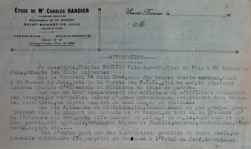 attestation de Charles Randier, adjoint du gestionnaire de compagnie du maquis61, puis secrétaire du comité cantonal de libération de Saint-Bonnet-de-Joux62