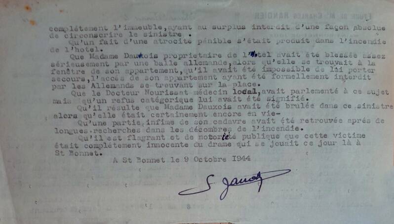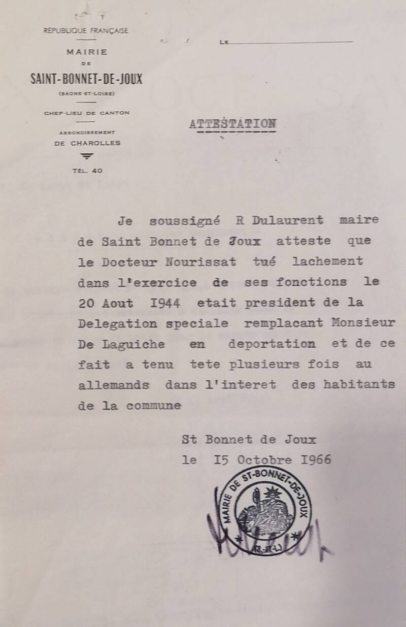 "Les Allemands étaient venus en force, avaient cerné le bourg, arrêté tous les gens qui se trouvaient dehors et les avaient conduits à la Mairie où ils devaient être interrogés. Alerté aussitôt, le Docteur Nourissat se rendit immédiatement à la mairie et me demanda de l'assister à ce moment critique. Toute la matinée et jusqu'à treize heures et demie environ, je puis certifier que le Docteur défendit courageusement tous ses administrés dont certain eurent à subir des interrogatoires serrés avec menaces appuyées par des coups. Un cardiaque (angine de poitrine) dut certainement la vie au Docteur qui empêcha la brutalité à son égard. D'autres également eurent leur salut aux énergiques interventions du Docteur Nourissat. Une maison devait encore sauter ce jour là. Le Docteur en empêcha. Quand les Allemands furent partis, j'adressais spontanément mes félicitations au Docteur. Je suis le seul témoin des efforts déployés ce jour, durant toute la matinée, par votre mari."40