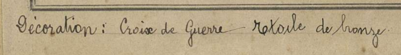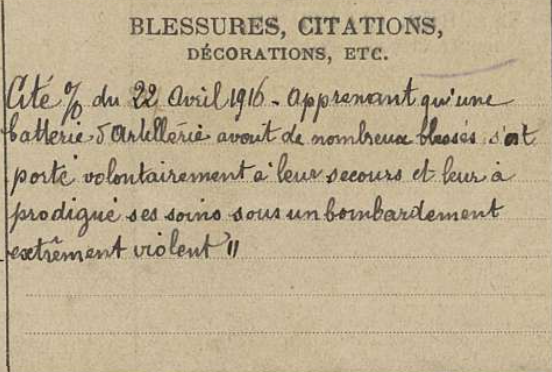 "Apprenant qu’une batterie d’artillerie avait de nombreux blessés s’est porté volontairement à leur secours et leur a prodigué des soins sous un bombardement extrêmement violent."